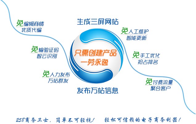 三屏展示的258商务卫士网站,免除用户的建站资金投入和时间成本,还同时实现了平台、手机网站的建设。用户只需要建立5个以上的公司产品,258商务卫士将自动生成电脑、手机、平板三种可以同时访问的网站,结合258集团独有的云计算系统,产生自动优化效果。这些网站从各种B2B和搜索引擎获得的流量,均无需额外付费,为企业用户实现轻成本的流量聚合功效。