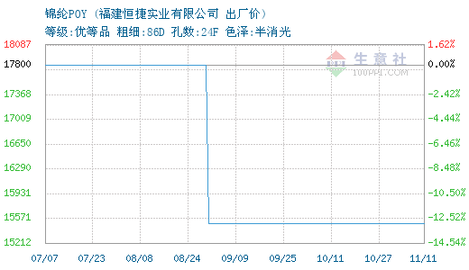 11月11日福建恒捷实业有限公司关于锦纶POY的报价为15500元/吨。锦纶POY的出产地为福建;仓储地为福建省;锦纶POY的属性:等级:优等品;粗细:86D;孔数:24F;色泽:半消光。该报价有效期为3天。